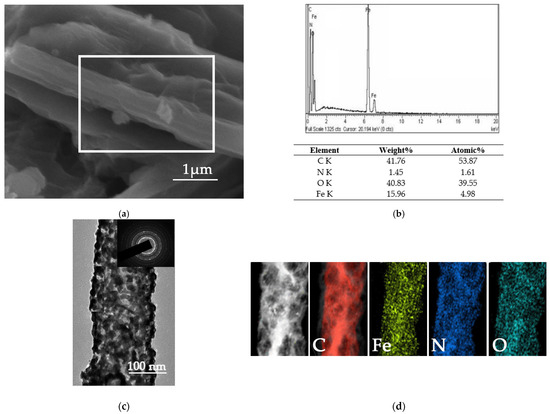 Figure 7c illustrates the modification of PAni nanorods with magnetite in a bright-field picture obtained by TEM. The propensity for magnetite nanoparticles (14 nm) to increase in average diameter due to aggregation on the surface of PAni nanorods is a direct result of their elevated surface tension, attributable to their spherical morphology and diminutive size. The SAED pattern (inset image in Figure 7c) exhibits a ring configuration, signifying the polycrystalline characteristics of magnetite. Subsequent to modification, the cubic lattice of spinel magnetite (Fe3O4) was verified. The scanning TEM image and corresponding elemental map (Figure 7d) further revealed that Fe and O elements were uniformly distributed throughout the whole PAni nanorods. All the observations confirmed the successful synthesis of PAni/Fe3O4.