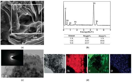 (a) SEM image of modified graphene oxide (GO) with titanium dioxide (TiO2). (b) Indicative area chemical microanalysis spectrum and the composition table of GO/TiO2 as determined by EDS. (c) Bright-field image of GO/TiO2 byΤΕΜ. The inset image illustrates the SAED detection of titanium dioxide and (d) an element mapping image.