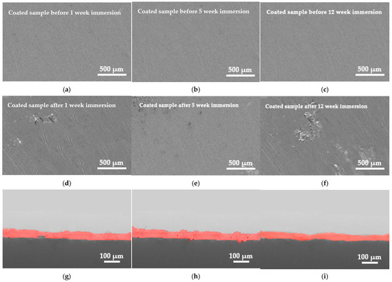 SEM micrographs of coated steel surface (a–c) before and (d–f) after immersion in ASW and (g–i) the corresponding cross-section.