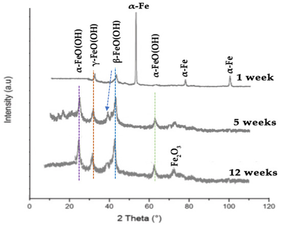 XRD diffraction peaks of corrosion products on the steel surface following 1, 7, and 12 weeks of static immersion in ASW.