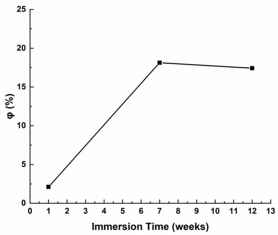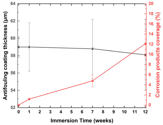The coating thickness diminished gradually (Figure 12), with slight variations at each measurement point (low standard deviation). The measurements of coating thickness excluded the corrosion products on its surface. The reduction in thickness is attributable to the dissolution of a portion of the AF-coated resin in the ASW. Cross-sectional images reveal that, despite 12 weeks of immersion in ASW, the adhesion to the steel substrate remained exemplary, with no cracking or flaking that could facilitate the development of a corrosion layer at the steel/coating interface. Furthermore, corrosion products were spatially confined to the coating surface, as indicated by the low percentage of corrosion coverage values.
