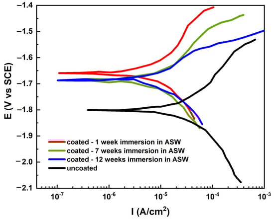 The naval steels with the antifouling coating were analyzed by measuring their potentiodynamic curves after varying immersion durations in artificial seawater, as illustrated in Figure 13. An uncoated sample of steel was examined for comparative analysis. The potentiodynamic curves of the coated samples clearly shifted to the left, with a less negative direction compared to those of the uncoated sample. Consequently, the corrosion potential values increase, and the curves correspond with diminished current density values across most of their range.