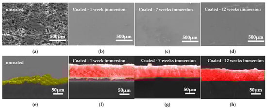 SEM micrographs from the surface of (a) uncoated sample and (b–d) coated steel and (e–h) the corresponding cross-sections, after potentiodynamic polarization tests. The corrosion products on the uncoated steel surface are seen in yellow, whilst the coating layer is represented in red.