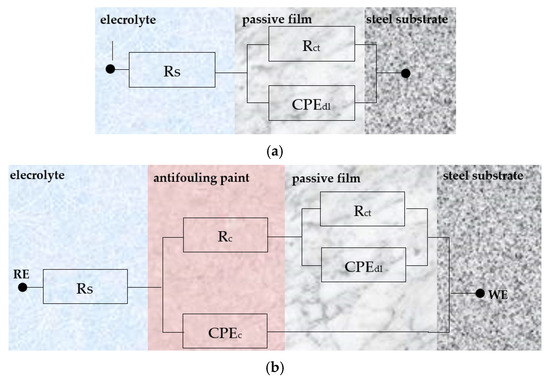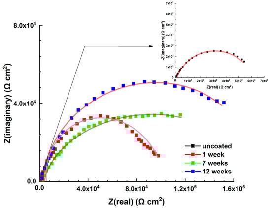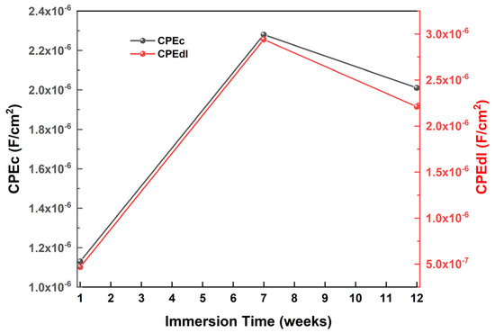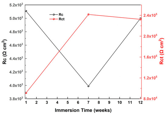 Table 1 indicated that the ECORR of the steel samples shifted to higher positive values with the application of the antifouling coating. The values of ECORR, ICORR, and Rp for the coated samples did not exhibit a monotonic decrease with increasing immersion time. Following one week of immersion in ASW, the ECORR of the coated sample rose by over 142 mV to −1.659 V, ICORR diminished to one-sixth of the ICORR of the uncoated sample at around 4.00 µA/cm2, and the Rp increased threefold to 6494 ohm/cm2 in comparison to the uncoated sample. The Rp had a modest decline; however, ICORR and ECORR grew throughout the subsequent six weeks of immersion. Upon extending the immersion duration to 12 weeks, the ECORR increased by only 1 mV, the Rp was increased by 13%, and the ICORR was diminished by almost 1.13 times in comparison to the coated sample immersed for 7 weeks. Despite the one-week immersion coated sample exhibiting the highest corrosion resistance, the positive ECORR value, along with the reduced corrosion current, signifies the excellent barrier properties of the antifouling coating even after prolonged exposure to artificial seawater.