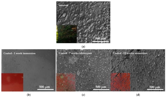 Figure 6 presents low-magnification SEM images of the surfaces of the coated steel samples prior to (Figure 10a–c) and subsequent to (Figure 10d–f) the laboratory static immersion test in ASW. The images provide definitive proof that, despite 12 weeks of continuous exposure of the coated specimen in ASW (Figure 10f), the corrosion products exhibit a minimal surface area. The surface of the coating exhibits no holes or cracks for both short (Figure 10d) and medium immersion durations (Figure 10e). Over a 12-week period in ASW, the specimen displays spatially localized corrosion products on its surface, while a significant area of the coated layer remains exposed (Figure 10f).