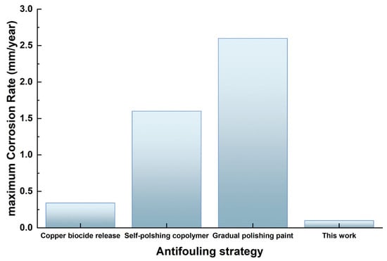 The accumulation of marine biofouling on structures and equipment in marine environments can lead to considerable consequences, particularly for the shipping sector. These consequences encompass increased fuel consumption [10], reduced speed and range capabilities [11], and the possible spread of marine pests [12]. Subsequent to the extensive ban on tributyltin (TBT) as a biocide in marine environments [13,14], copper oxide (Cu2O) has become the primary antifouling biocide utilized in marine coatings [15,16]. Copper oxide antifouling paints have proven effective in preventing fouling on a substantial segment of the global steel hull fleet, provided they are applied at an optimal thickness and receive regular maintenance and replenishment [17]. Therefore, it is reasonable to propose that copper-based antifouling systems, often utilized on steel hulls, may provide enhanced protection against fouling in comparison to the currently approved alternatives. Recent research [18] and certain coating manufacturers suggest that modern copper-based antifouling coatings do not contain metallic copper. They comprise cuprous and cupric oxide. Consequently, it is asserted that these coatings can be applied over an epoxy barrier layer on naval steels without detrimental effects. It is essential that materials used for marine applications comply with stricter standards to protect the environment, aquatic organisms, and human health [19,20,21]. Consequently, there exists a substantial demand for nonbiocidal antifouling coatings.
