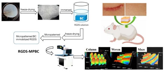 | [112] | 2019 | Bacterial cellulose with RGDS peptide (RGDS-MPBC) | CO2 laser photolithography and targeted RGDS immobilization |