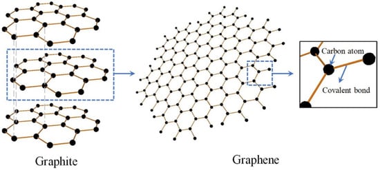 The high prospects of graphene in diverse applications demand efficient and stable synthetic ways to produce quality graphene materials. For its application, graphene has been required to fulfill necessary properties including a well-defined layer number, uniform lateral dimension, low defects, and high purity. These characteristics strongly influence graphene’s performance in its final application since its electrical, mechanical, and chemical properties are very much dependent on its structure and composition [7]. The choice of raw materials is an important consideration to meet the application requirements of graphene specifications. Graphite is the most popular C precursor due to the fact that it can easily be exfoliated into graphene sheets due to its layered structure [8]. The structural transformation from graphite to graphene is illustrated in Figure 2. Moreover, graphite is abundant, relatively inexpensive, and chemically stable, making it an excellent source material for various graphene synthesis methods [9]. In addition to graphite, other low-cost carbon sources, such as biomass, including coconut shells and candlenut shells, have also been explored [10]. However, biomass-derived precursors typically require longer processing times to develop a carbon-like structure and to effectively remove inherent impurities [11].