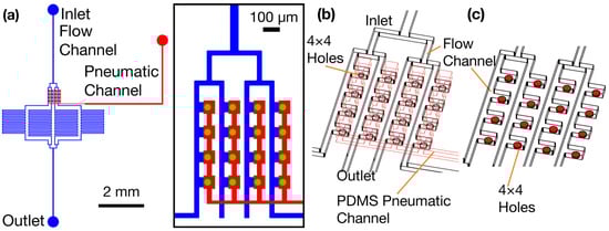 A thin PDMS membrane separates the flow channel and pneumatic channel. When pneumatic pressure is applied, this membrane works as a pneumatic valve for openings (Figure 1b). The three-dimensional relationship between the flow channels and superimposed pneumatic channels is illustrated in Figure 1b, showing how the layers are integrated for parallel operation.