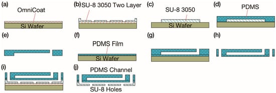 Microholes and flow channels were fabricated in SU-8 (Figure 2a,b). A 4-inch Si wafer was cleaned with acetone and isopropyl alcohol (IPA) and blown with nitrogen gas. The Si wafer was coated with a sacrificial layer of OmniCoat (Kayaku Advanced Materials, Westborough, MA, USA) (Figure 2a). A solution of OmniCoat was spin-coated (1H-DX2, MIKASA Co., Ltd., Tokyo, Japan) with a ramp for 5 s, at 500 rpm for 20 s, a ramp for 5 s, rotation at 1200 rpm for 60 s, and finally a ramp for 10 s. It was baked at 190 °C for 1 min.