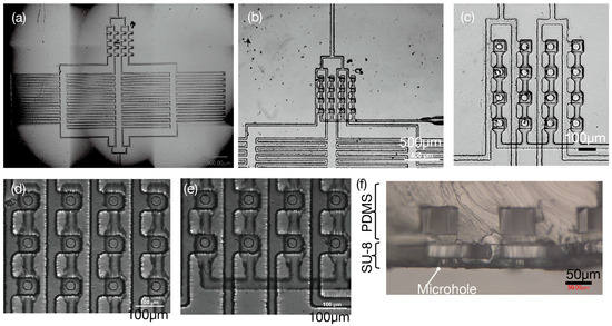 Figure 4b shows the central region of the microchip, while Figure 4c displays a close-up view of the 4 × 4 micronozzles. The misalignment of the SU-8 and PDMS layers was within 5 μm, and the accuracy was sufficient for operation. This high alignment precision was achieved through careful stereomicroscope-guided positioning during the bonding process. The successful alignment is evident in Figure 4d,e, which show proper alignment between pneumatic channels, openings, and flow channels across multiple rows of micronozzles, with Figure 4d displaying three rows and Figure 4e showing two rows.