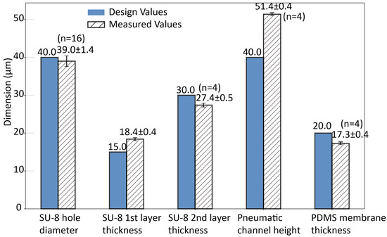 The dimensions of the major structures of the micronozzle array are shown in Figure 5. Through-holes were created on the bottom SU-8 structure, and the diameter of the holes was 39.0 ± 1.4 μm (n = 16). This represents only a 2.5% deviation from the target design value of 40 μm, demonstrating the precision of the photolithography process. The hole diameter was set to be larger than single cells. Figure 4f is a cross-sectional view of the microfluidic transport structure. The height of the pneumatic channel was 51.4 ± 0.4 μm (n = 4). The height of the microholes was 18.4 ± 0.4 μm (n = 4). The height of the two SU-8 layers was 27.4 ± 0.5 μm (n = 4).