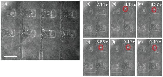 The flow through a nozzle array was measured using tracer latex beads (L4530, carboxylate-modified polystyrene, fluorescent yellow–green, a solid composition of 2.5%, SIGMA-Aldrich, St. Louis, MO, USA). The average particle size was about 0.5 µm, and the excitation wavelength was 470 nm. The experiment was repeated using tracer particles of size 2 µm at varying applied pressures. The motion of 5 particles was tracked for one value of applied pressure to calculate the flow velocity and volumetric flow rate through the openings. Furthermore, 10 µm particles were used at a constant applied pressure to check if the fabricated device dispensed particles with a near-cell diameter. Compressed air was supplied to the pneumatic channel in the nozzle array through a pressure control device (Figure 3c). Observations were made with an inverted microscope (Eclipse Ti-U, Nikon, Tokyo, Japan) and a digital camera (DIGITAL SIGHT DS-QiMc, Nikon) or a high-speed camera (HAS-D71, DITECT Co., Ltd., Tokyo, Japan). For high-speed imaging, the image size was 640 × 480 pixels with frame rates of 500 and 1000 frames per second (fps).