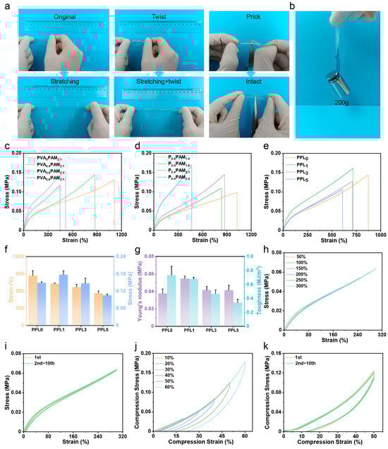 Figure 2a illustrates that the PPL hydrogels exhibit high flexibility and toughness, which can be readily stretched, twisted, and elongated after twisting. Notably, when subjected to stretching, the tip of a pair of scissors barely penetrated the PPL hydrogel, demonstrating its excellent puncture resistance. Additionally, it demonstrated the capacity to support a weight of up to 200 g (Figure 2b). Superior mechanical properties and strong stretchability of PPL hydrogels likely stem from their DN structures. The brittle network of physically cross-linked PVA can impart high toughness via energy dissipation from internal fractures, while the interpenetrating network of chemically cross-linked PAM can deliver strong tensile performance.