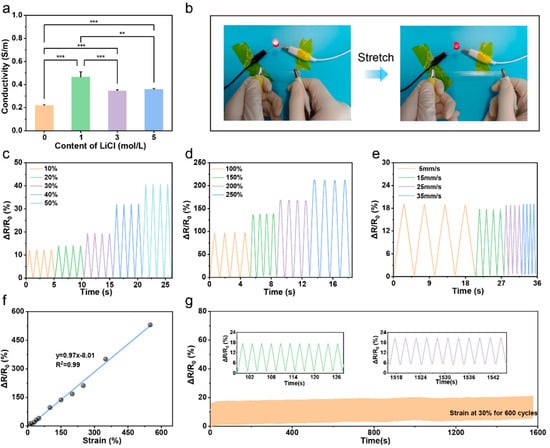 The conductivity and strain sensitivity of the PPL1 hydrogel. (a) Conductivity of PPL hydrogels with different LiCl contents. (b) The brightness of the LED while the PPL1 hydrogel is being stretched. (c,d) ΔR/R0 of PPL1 hydrogels of different strains and (e) of different frequencies. (f) The strain of the PPL1 hydrogel sensitivity curve. (g) The sensing stability test of the PPL1 hydrogel strain sensor under approximately 600 cycles at 30% strain. Data are shown as mean ± SD (n = 3). ** p < 0.01, *** p < 0.001.