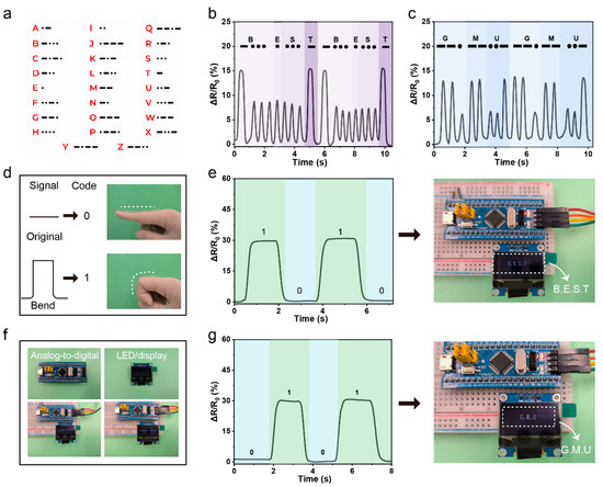 In addition to detecting electrical signal variations, reliable signal transmission represents a crucial requirement for practical applications. The PPL1-based sensor exhibits promising potential for information encryption applications due to its excellent sensitivity, outstanding mechanical properties, cost-effectiveness, and scalability for mass production. Morse code, which utilizes sequences of “dots” and “dashes,” is a widely recognized and effective means of communication, encoding alphabetic characters, numerals, and punctuation through distinct patterns formed by these two fundamental signal units. This hydrogel sensor was further utilized for encrypted communication via Morse code. Figure 5a displays the complete Morse code sequences corresponding to all 26 English letters. The coding mechanism was implemented through finger flexion-induced strain signals, where high-amplitude bending (large strain) and low-amplitude bending (small strain) were, respectively, interpreted as dashes (“—”) and dots (“·”). By combining these fundamental signals into predefined waveforms corresponding to specific letters, continuous bending motions could form coherent phrases. Notably, each character exhibited a distinctive signal waveform pattern (Figure 5b,c), enabling information transmission through sequenced phrases, as demonstrated by the successful encoding of words like “BEST” and “GMU”. Therefore, these results highlight how encrypted data transmission could significantly expand the application scope of flexible wearable sensors. In conclusion, the PPL1 hydrogel developed herein shows considerable potential in information recording and transmission, thus expanding the application scope of hydrogel sensors.