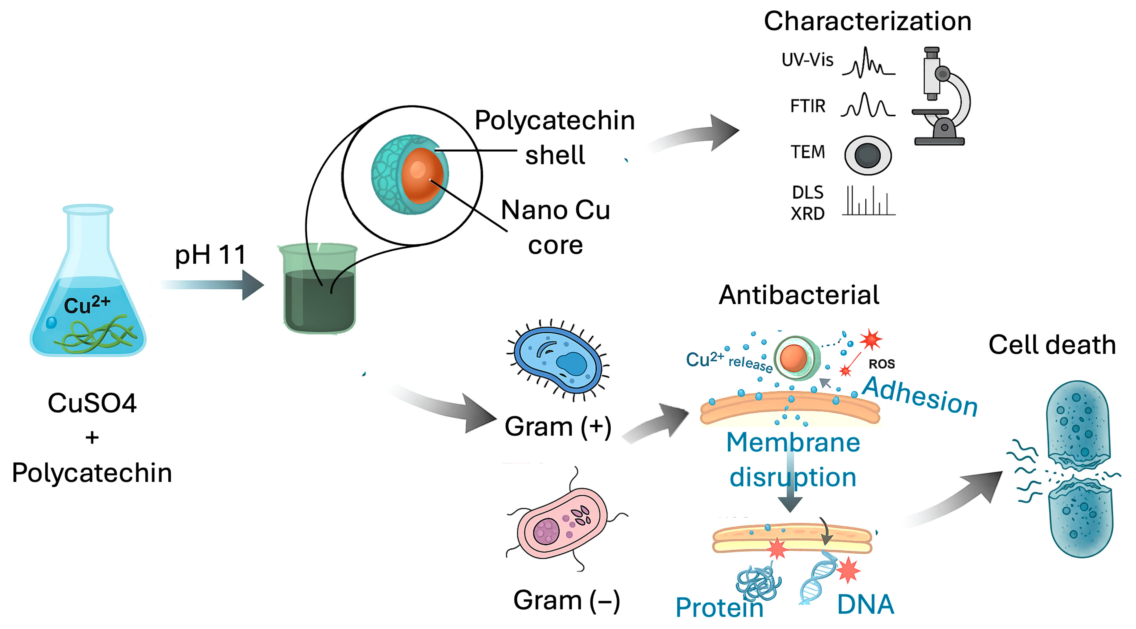 Previous studies have highlighted the potential of monomeric catechin but also its limited stability and the need for harsh alkaline conditions (pH ~11) to induce polymerization, compromising structural control and reproducibility. We hypothesized that by employing a pre-synthesized, well-defined, and stable polycatechin polymer as a dual-function agent, we could overcome these limitations. This approach aims to create a core–shell nanosystem (Cu@polycat) where the robust polycatechin shell not only prevents oxidation and aggregation but also acts synergistically with the copper core to enhance antibacterial and anti-biofilm efficacy. The overall process is schematically illustrated in