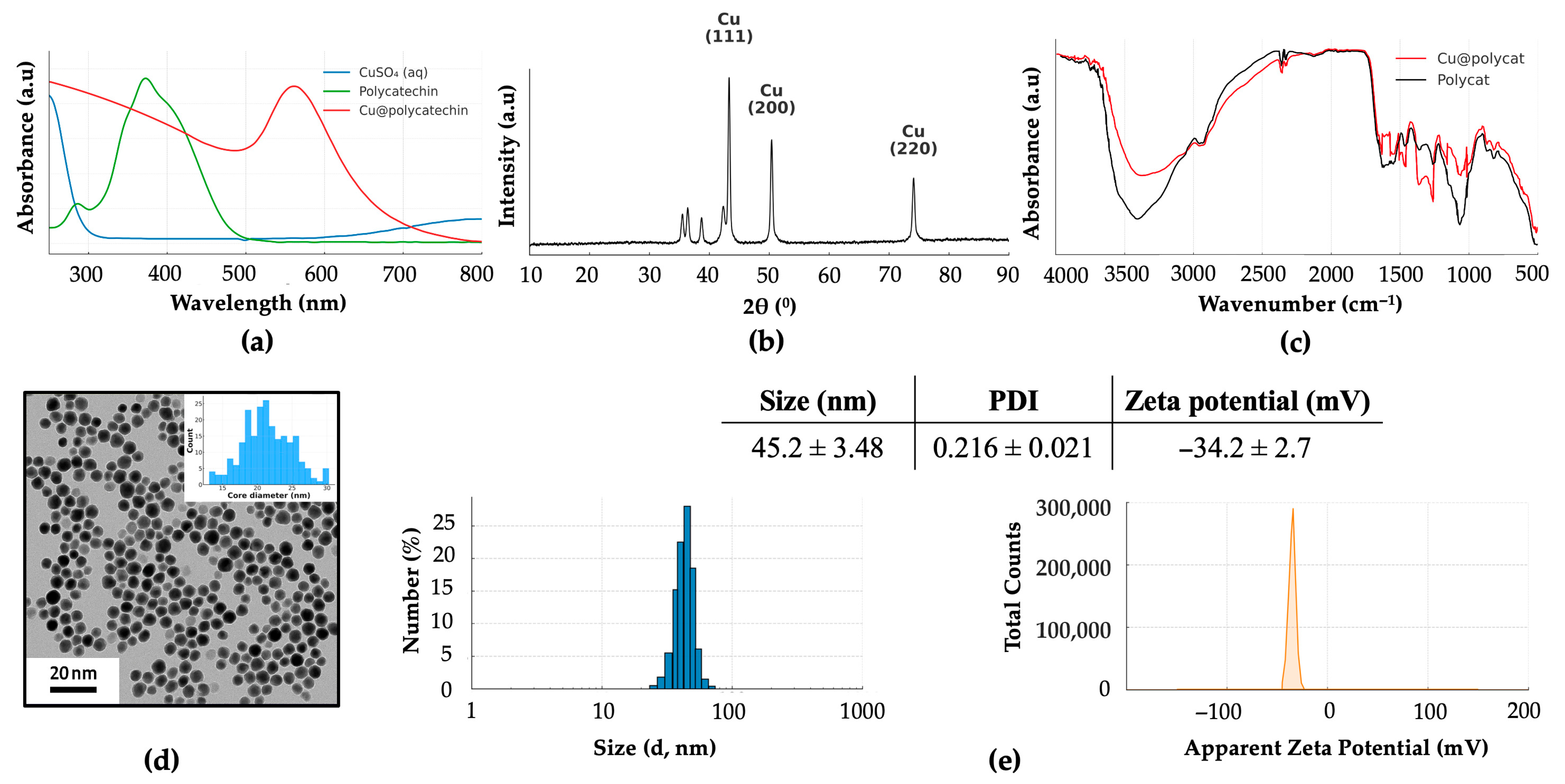 The reduction of Cu2+ ions and the formation of metallic copper nanoparticles were monitored by tracking the surface plasmon resonance (SPR) band using a UV-Vis spectrophotometer (Shimadzu UV-2600, Kyoto, Japan). Spectra of the colloidal suspensions were recorded in the range of 400 to 800 nm at room temperature, using water as a blank. The morphology, size, and size distribution of the nanoparticle cores were analyzed by TEM (JEOL JEM-2100, Tokyo, Japan) operating at an accelerating voltage of 200 kV. A drop of the diluted nanoparticle suspension was deposited onto a carbon-coated copper grid and allowed to air-dry at room temperature. The core size distribution was determined by measuring the diameter of over 100 individual nanoparticles from multiple TEM images using ImageJ software v.1.54.b (National Institutes of Health, Bethesda, MD, USA). The hydrodynamic diameter and polydispersity index (PDI) of the nanoparticles in aqueous suspension were measured by Dynamic Light Scattering (DLS), while the Zeta potential (ZP) was determined via laser Doppler micro-electrophoresis. Both measurements were performed at 25 °C using a Zetasizer Nano ZS instrument (Malvern Panalytical, Malvern, UK). Samples were appropriately diluted with deionized water to avoid scattering artifacts, and measurements were performed in triplicate. The crystalline structure and phase composition of the nanoparticle powder were analyzed by XRD using a Bruker D8 Advance diffractometer (Billerica, MA, USA) with Cu Kα radiation (λ = 1.5406 Å). The data were collected in the 2θ range of 20° to 80° with a step size of 0.02° and a scanning speed of 2° per minute. The crystalline phases were identified by matching the diffraction patterns with standards from the International Centre for Diffraction Data (ICDD) database. The chemical composition of the organic shell and the interaction between polycatechin and the copper surface were investigated by FTIR spectroscopy. Samples (nanoparticle powder or pure polycatechin) were placed directly onto the diamond crystal, and spectra were recorded in the range of 4000 to 400 cm−1 with a resolution of 4 cm−1 and 32 scans per sample. Hydrodynamic diameter (D_h) and ζ-potential were measured by dynamic light scattering and electrophoretic light scattering, respectively (25 °C; backscatter detection 173°; ζ measured in 1 mM KCl). The apparent organic-shell thickness was estimated as (D_h − core diameter_TEM)/2 for descriptive purposes.