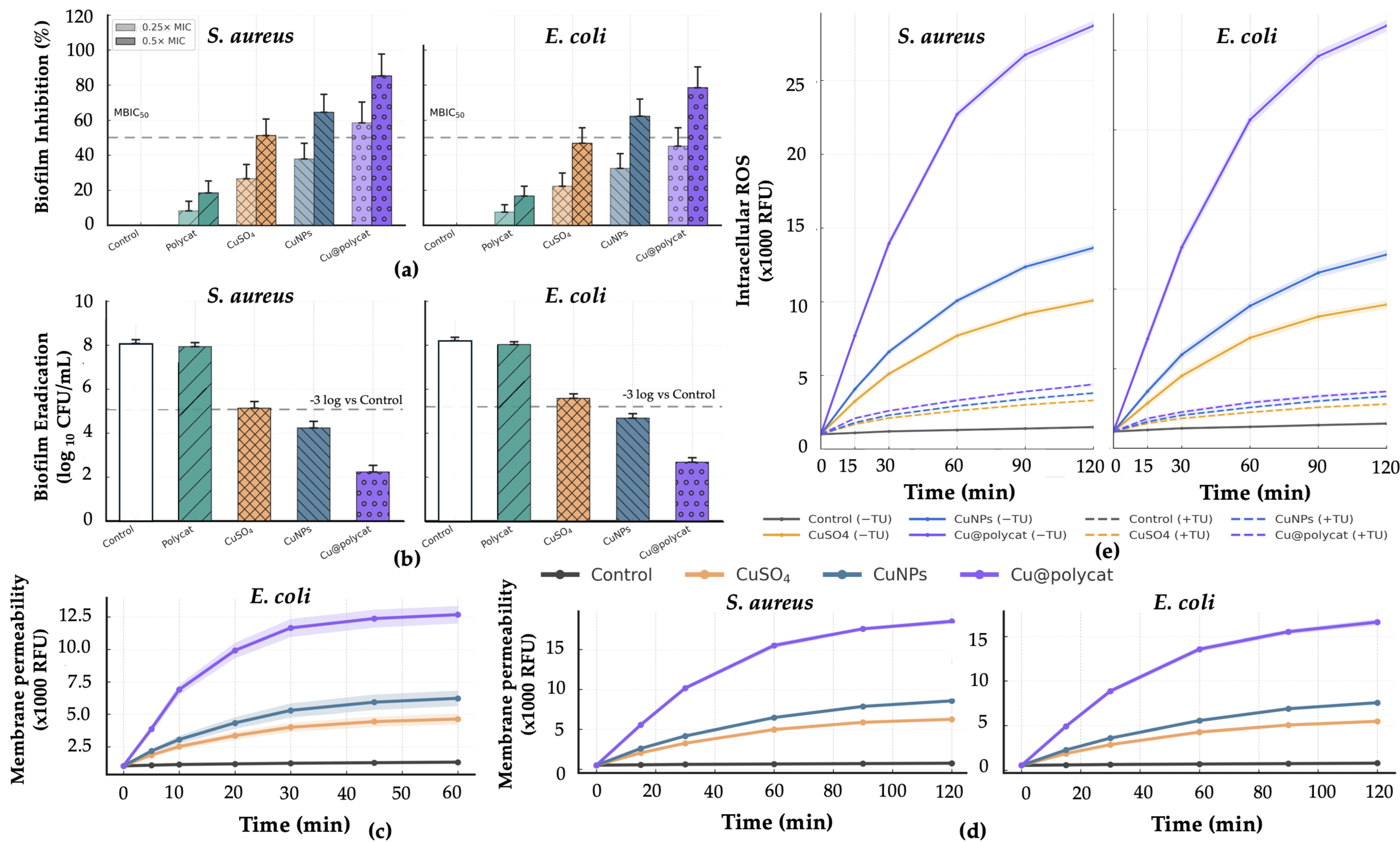7]. Cu@polycat strongly inhibited biofilm formation (>80% at sub-MIC) and, critically, achieved ≥3-log10 viable-count reduction in 24 h mature biofilms under the same exposure conditions where the β-lactam comparator ampicillin was ineffective (no ≥3-log10 reduction). We attribute this to the ~45 nm hydrodynamic size and polycatechin corona that facilitate diffusion through the EPS matrix and multi-target copper-driven damage to embedded/persister cells.