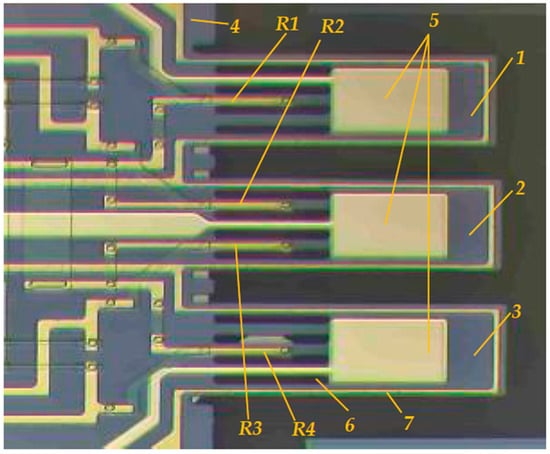 Figure 3 also clearly depicts the structural elements of the triple-microcantilever system. Bulk micromachining technology was used to fabricate the three microcantilevers (1, 2 and 3) from the silicon substrate (4), which have a thickness of 4 µm. The lengths of the microcantilevers range from 250 to 295 µm, and their widths vary around 150 µm. The dimensions were chosen to make sure that their natural frequencies do not differ by more than 2 kHz. The formation of piezoresistors R1, R2, R3, and R4 is carried out on the microcantilevers according to the schematic representation depicted in Figure 2a. Each microcantilever has a gold pad (5), which can be functionalized to detect specific viruses, pathogens, or trace gases. Four rectangular apertures are made at its fixed ends to adjust the stiffness of the cantilever. Microlaser cutting can be used to change the stiffness of a microcantilever by removing a segment of the wall that forms the rectangular holes. A thin aluminum wire (7) is formed on each microcantilever, which outlines it externally and serves as a heater. Each microcantilever or a selected combination of microcantilevers can be individually heated by the heater terminals.