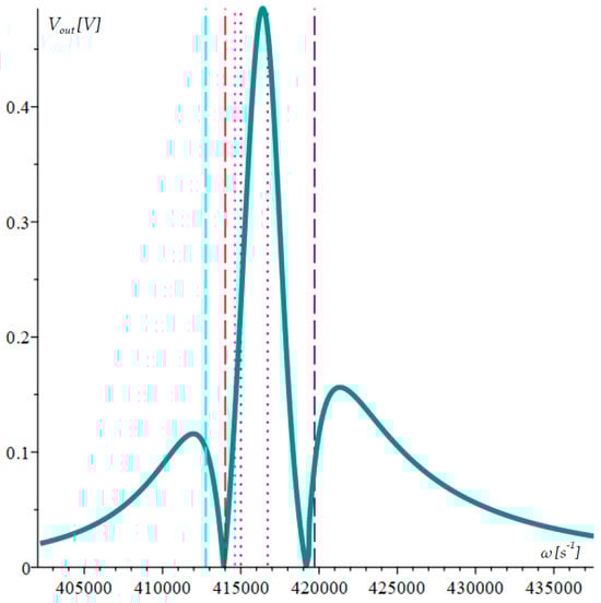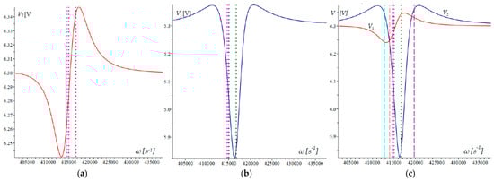 Figure 5c displays the two divider voltages, with the dotted lines representing the natural frequencies. The dashed lines on this plot represent the frequencies at which the mechanical amplitude–frequency responses intersect. The general arrangement of these lines relative to the maxima and intersections of the divisors suggests that the relationship between them is complex and difficult to analyze.