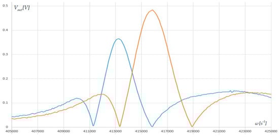 Figure 5a,b show the voltages of the first and second dividers. The three microcantilevers’ natural frequencies can be identified by the vertical dotted lines on these plots. It is noteworthy that the extreme voltage values of the dividers do not occur at the natural frequencies.