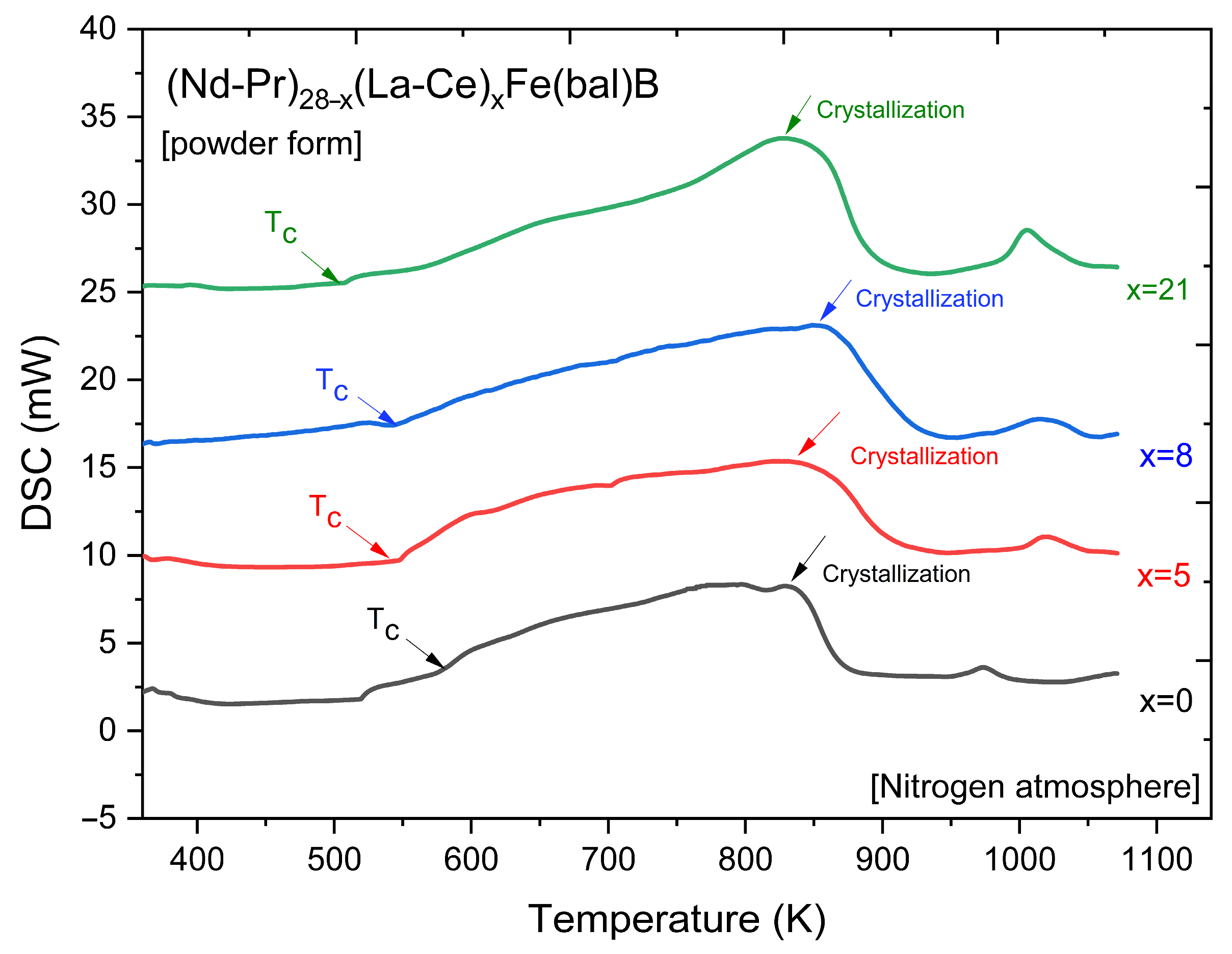 4]. At the highest substitution level (x = 21), the sample exhibits the lowest magnetic performance, demonstrating that excessive (La,Ce) incorporation compromises the hard-magnetic characteristics of NdFeB-type powders. These results confirm that while partial substitution can reduce material cost and improve thermal stability, it inevitably leads to a trade-off in magnetic strength.