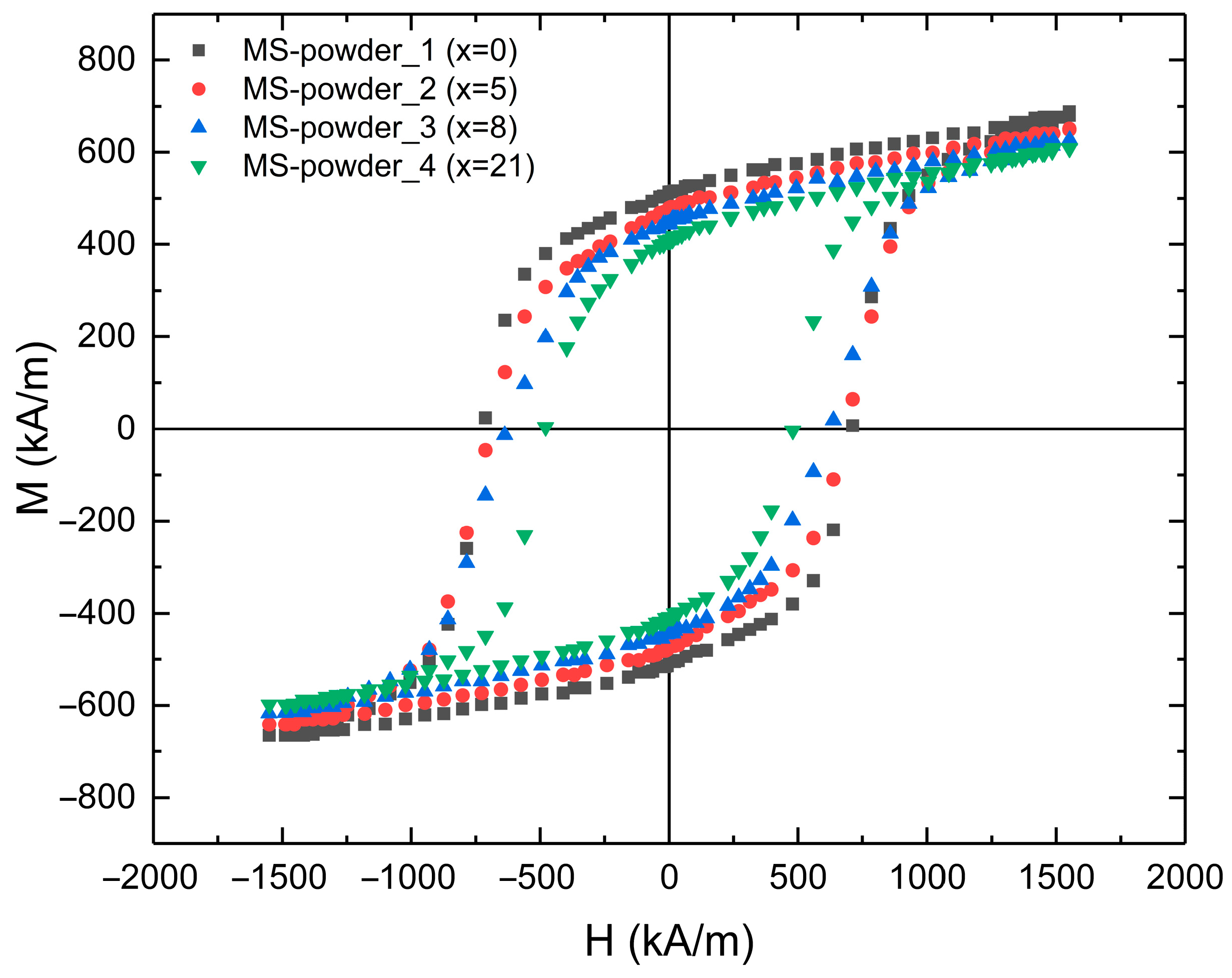 r gradually decrease, accompanied by a reduction in the coercive field. The reference powder (MS-Powder_1, x = 0) shows the highest magnetic parameters