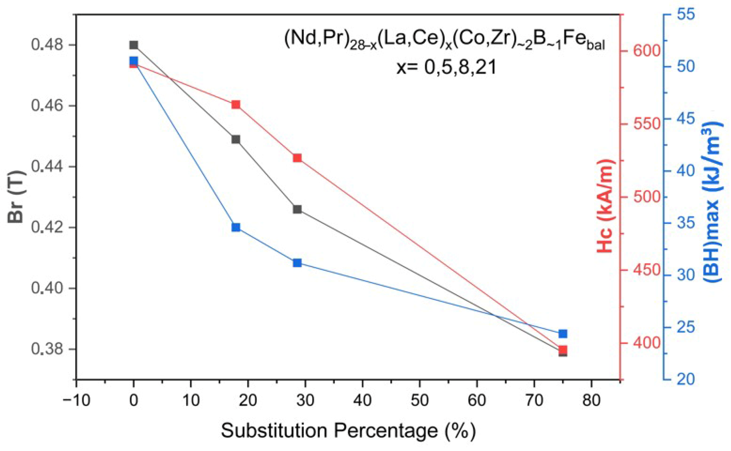 sub ratio up to 75%—using Equation (1)—indicating a gradual deterioration of magnetic performance. The reference composition (x = 0) exhibits the highest