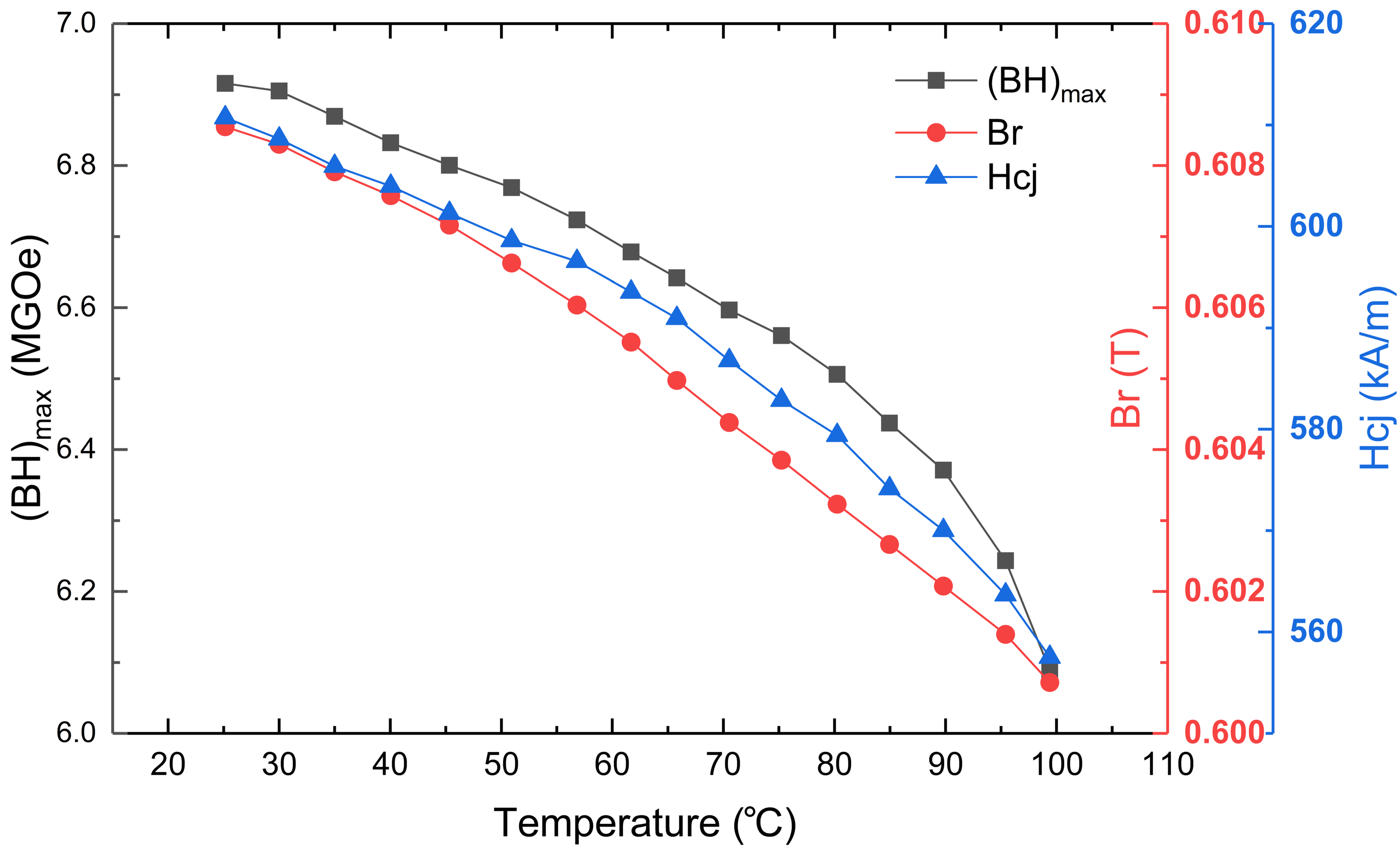 0 = 25 °C (room temperature) to 100 °C. At each temperature step, full demagnetization (B–H) curves were recorded after thermal equilibration. The parameters extracted from the demagnetization curves were the intrinsic coercivity (
