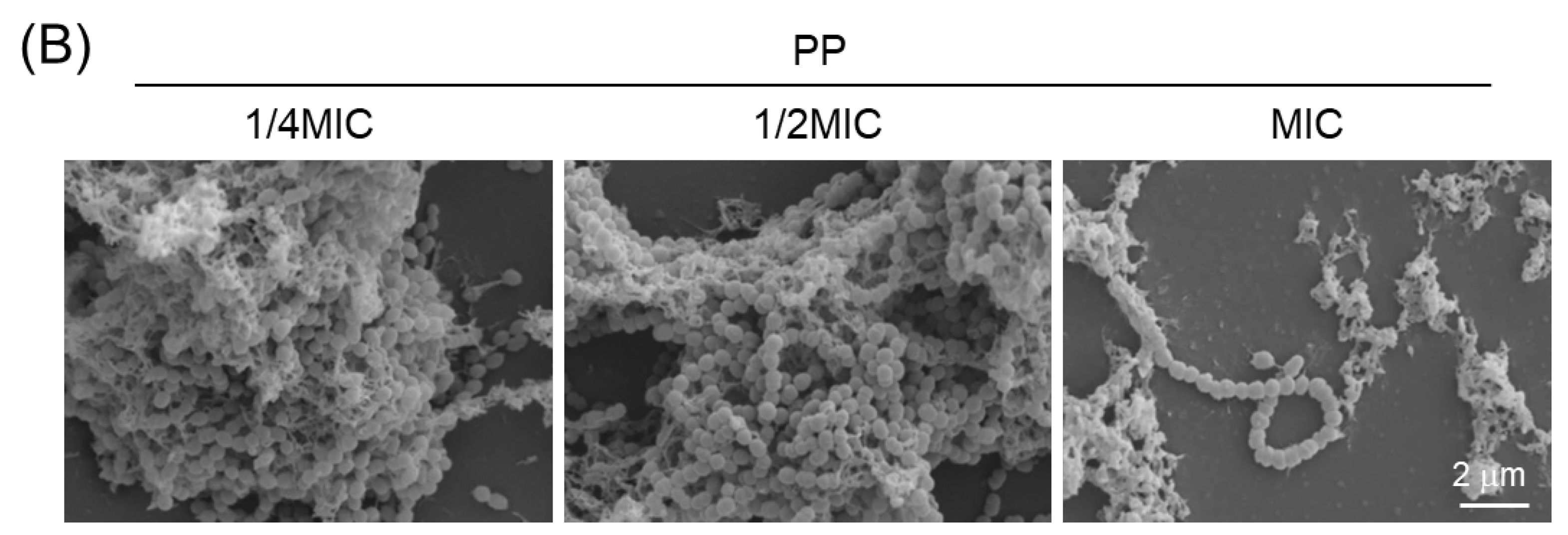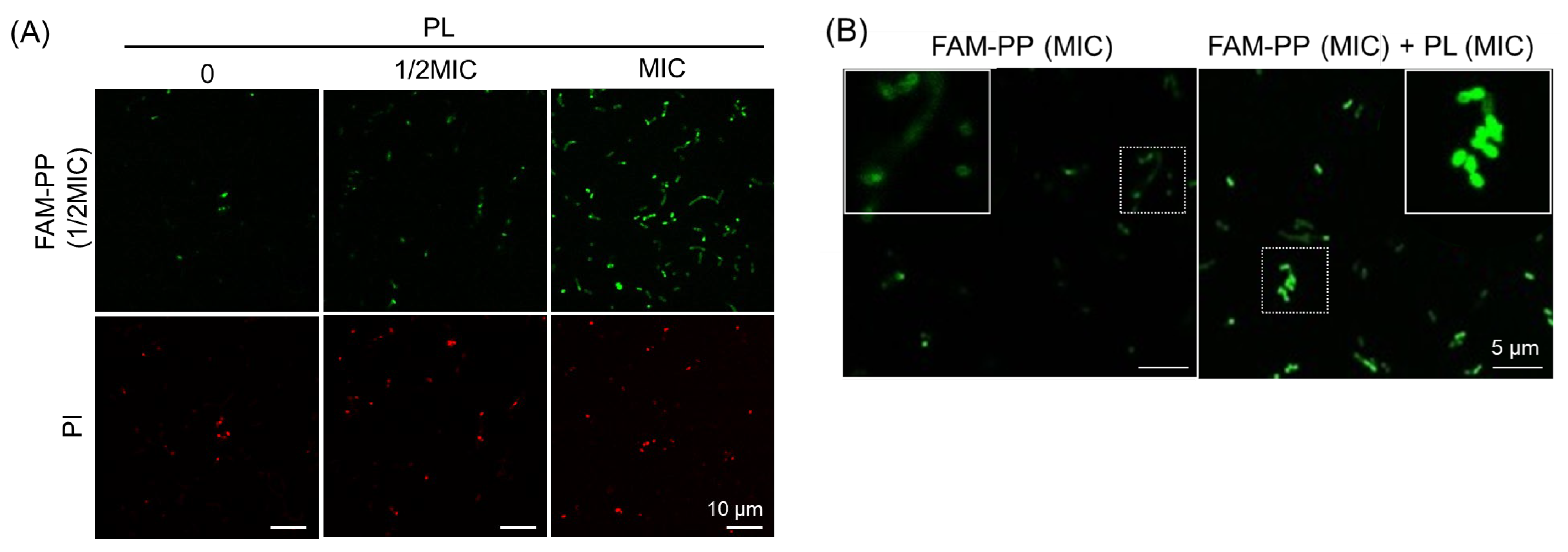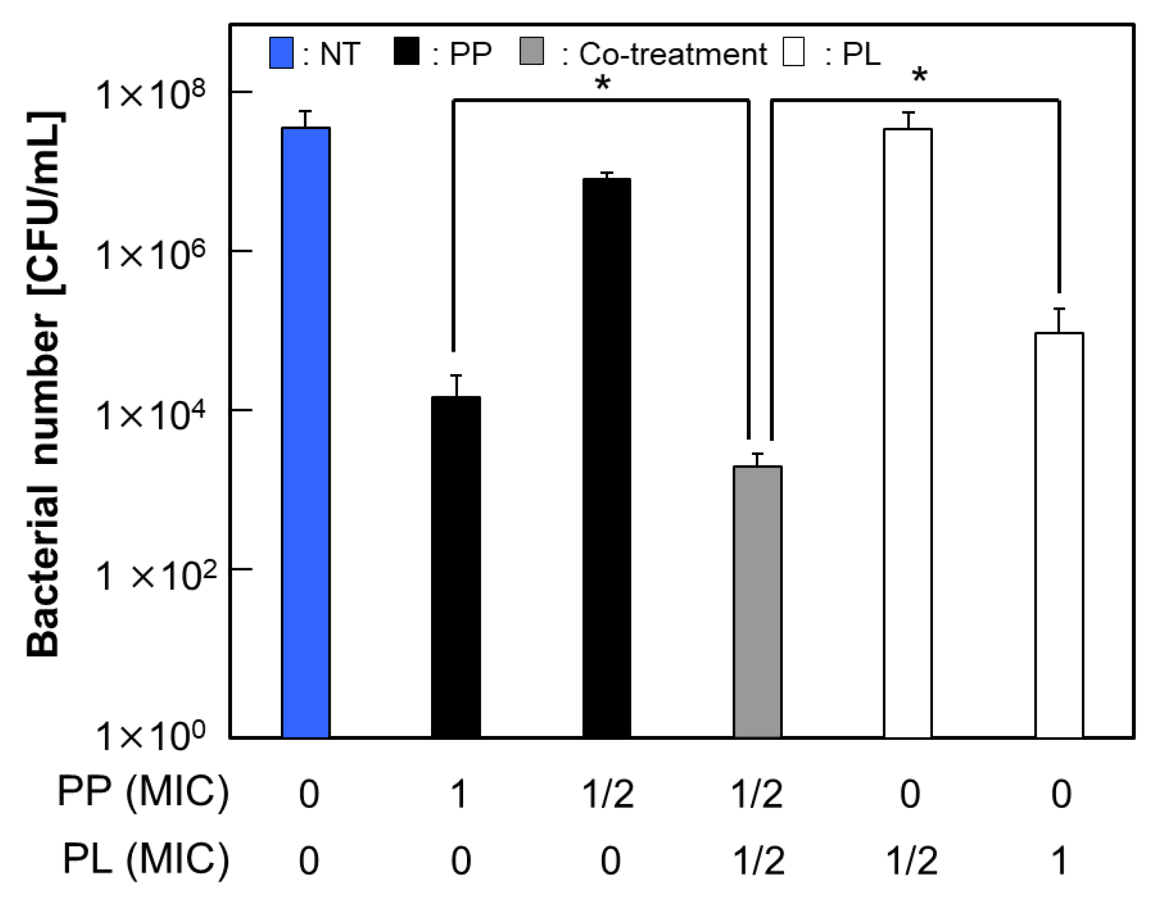 3.2. Synergistic Antimicrobial Activity of Cotreatment with PP and PL