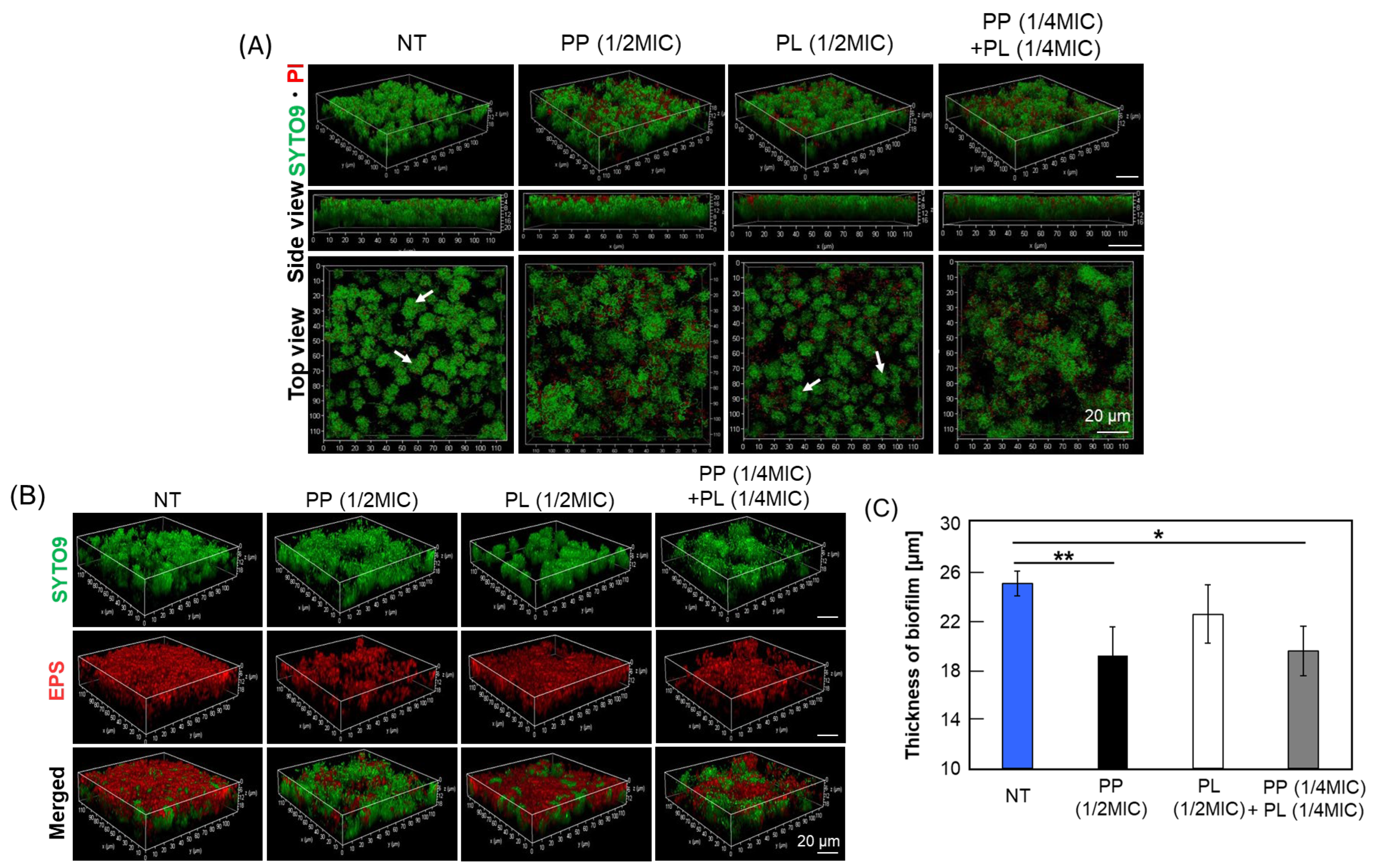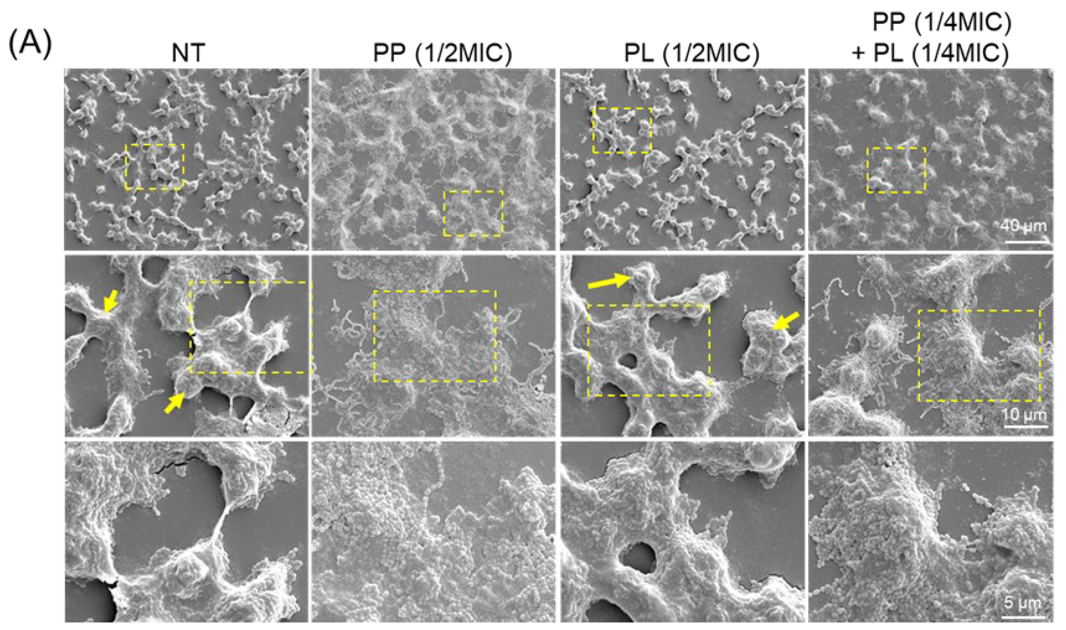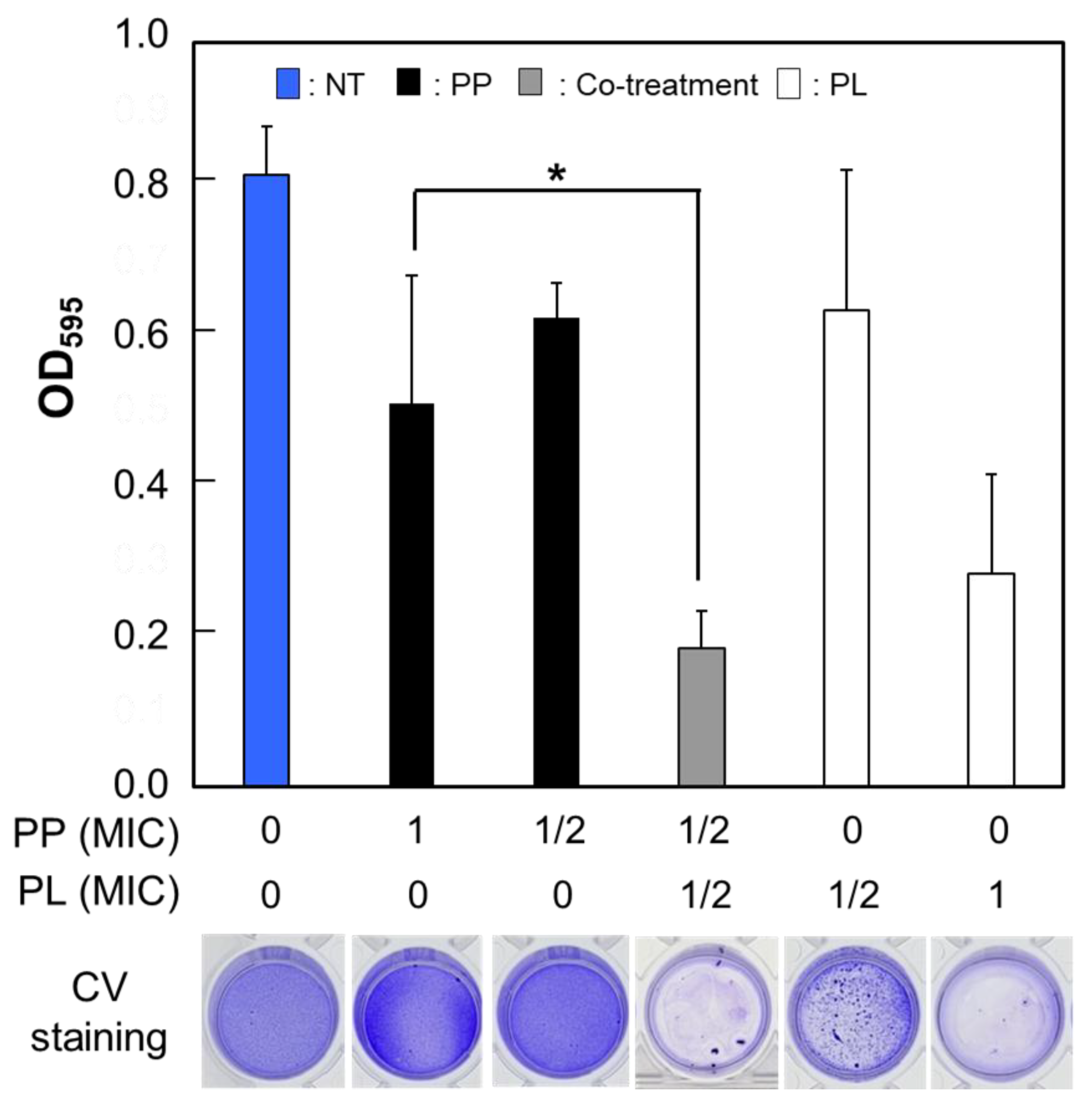 3.4. Enhanced Inhibition of Biofilm Formation Following Cotreatment with PP and PL