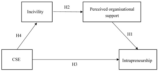 Conceptualising CSE in line with the approach/ avoidance motivation framework indicates that higher levels of CSE are linked with a strong approach disposition and weak avoidance disposition [45], suggesting that individuals high in CSE are more sensitive to positive stimuli and less sensitive to negative stimuli. In contrast, individuals who score low in CSE are more sensitive to negative stimuli and less sensitive to positive stimuli [44]. It is theorised that acts of workplace aggression, such as workplace incivility where the intent is unclear [46], may produce feelings of anxiety—an avoidance-based emotion—leading to avoidance-based behaviours [47]. Therefore, an individual high in CSE should be less sensitive to workplace incivility than an individual low in CSE. This outcome could then be further influenced by organisational support (or lack thereof), which depending on the perception of the individual, may serve to increase (or decrease) intrapreneurship. Shalley et al. [48] support this view, suggesting that contextual characteristics such as workplace relationships and management support interact with personal characteristics such as personality to predict creativity. This is an important distinction as policies and practices can be developed to improve organisational factors such as incivility and organisational support. Therefore, we hypothesise that CSE influences intrapreneurship, such that individuals high in CSE will exhibit higher intrapreneurship (H3), but that this effect is likely to be mediated by both incivility and perceived organisational support (H4).