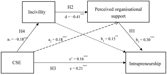 The relationship between incivility and perceived organisational support (path d) was also statistically significant but negative, t(401) = −5.99, p < 0.001, proposing that higher levels of incivility are related to decreased levels of perceived organisational support. The path representing the relationship between CSE and intrapreneurship (i.e., path c) was significant, t(402) = 5.46, p < 0.001 (supporting H3). However, in the presence of the mediators, the effect of CSE on intrapreneurship (i.e., path c’) was reduced, yet remained significant, t(400) = 4.07, p < 0.001. Therefore, mediation was confirmed due to the reduction in the effect size of CSE on intrapreneurship with the inclusion of incivility and perceived organisational support as mediators (supporting H4).