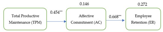 The measure for TPM practices was developed based on previous research [,,,,], and insight gained from our preliminary investigations in Sri Lanka. The measure covered areas of autonomous, planned and quality maintenance, focused improvement, health, safety and environment; education and training; development management; office TPM. An example items include “Operators are given specific training to improve their ma-chine maintenance skills”, “Operators are empowered to attend machine cleaning, routine maintenance and minor adjustments”, “Systems are implemented for identification and elimination of loses”, and “Safety initiatives and devices are in place on the machines to ensure safety of the employees”. Employee retention was measured using the scale adopted from Hui et al. []; Example items include “I often think of leaving the organization” and “it is very possible that I will look for a new job next year”. AC was measured using the scale adopted from Meyer et al. []. An example item includes “I feel a strong sense of belonging to the organization”.