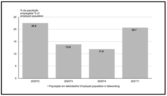 Portugal had the first cases on the 2nd of March, and 22nd of March the Government declared telework obligatory until the 1st of August. Telework became obligatory between 4 November 2021 and 6 January 2022. In the second quarter of 2020, the most significant proportion (22.6%) of the population was always employed or almost always in telework. In the third and fourth quarters of 2020, with the slowdown of the measures to contain the pandemic and the growing lack of definition, this proportion decreased, but has increased again in the first quarter of 2021, with the implementation of new restrictive measures and new confinement [11] (Figure 1).
