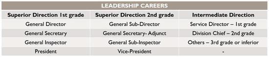 Management positions include direction, management, coordination, and control of public services and workers. Managerial positions are qualified for senior and intermediate management positions, depending on their hierarchical level, competencies, and responsibilities (DGAEP, 2022) (Figure 3).