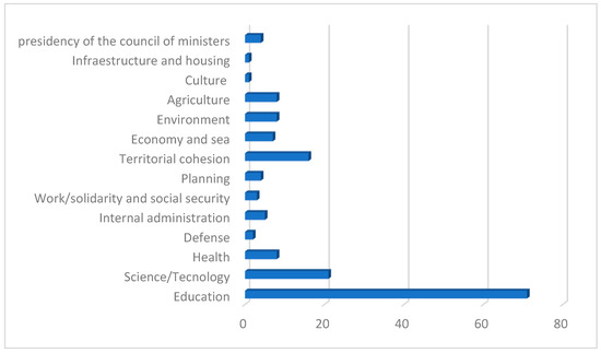 The 159 participants of this study have middle and senior management positions, currently working in a central public administration organism of the State. Among the one hundred and fifty-nine participants, four (2.5%) work in the presidency of the council of ministers, one (0.6%) in infrastructure and housing, one (0.6%) in culture, eight (5%) in agriculture, eight (5%) in environment, seven (4.4%) in the economy and sea, sixteen (10.1%) in territorial cohesion, four (2.5%) in planning, three (1.9%) in work/solidarity and social security, five (3.1%) in internal administration, two (1.3%) in defense, eight (5.1%) in health, twenty-one (13.3%) in science/ technology, and seventy-one (44,7%) in education (Figure 4).