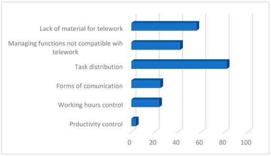 In response to the question “In which areas did telework during the COVID-19 pandemic have more impact?” the following results were obtained: four (2.5%) of the participants mentioned productivity control; twenty-four (15.1%) the working hours’ control; twenty-five (15.5%) the forms of communication; eighty-two (51.6%) the task distribution; forty-two (26.4%) the managing functions not compatible with telework; fifty-six (35.2%) the lack of material for telework (Figure 6).