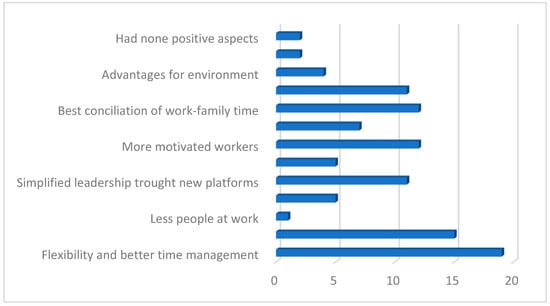 As positive aspects of teleworking, the participants mentioned flexibility and better time management, communication became simpler, and there was greater motivation. Regarding flexibility and time management, when teleworking employees do not spend time travelling it allows them to have more time for other tasks.