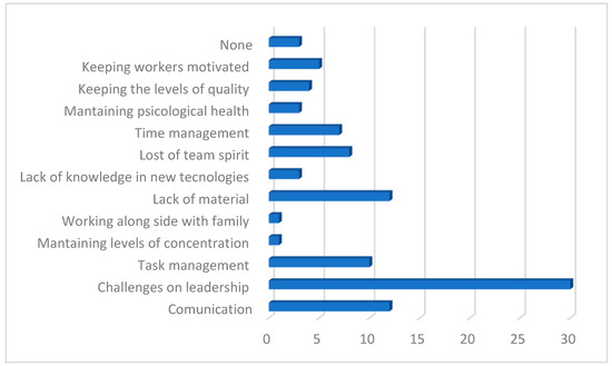 When answering the question “Regarding leadership, enumerate some negative aspects of telework”, the participants mentioned: twelve (7.5%) communication, thirty (18.9%) challenges in leadership, ten (6.3%) task management, one (0.6%) maintaining levels of concentration, one (0.6%) working alongside with family, twelve (7.5%) lack of material, three (1.9%) lack of knowledge in new technologies, eight (5%) loss of team spirit, seven (4.4%) time management, three (1.9%) maintaining psychological health, four (2.5%) keeping the levels of quality, five (3.1%) keeping workers motivated, and three (1.9%) stated that there were no negative aspects (Figure 9).