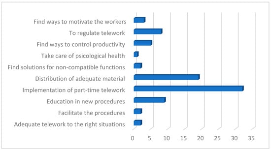 Finally, when answering the question “Which solutions can you indicate to minimize the negative impacts of telework”, the participants mentioned the following suggestions for improvement: two (1.3%) adequate telework in the right situations, two (1.3%) facilitate the procedures, nine (5.7%) education in new procedures, thirty-two (20.1%) implementation of part-time telework, nineteen (11.9%) distribution of adequate material, two (1.3%) find solutions for non-compatible functions, one (0.6%) take care of psychological health, five (3.1%) find ways to control productivity, eight (5%) to regulate telework, and three (1.9%) find ways to motivate the workers (Figure 10).