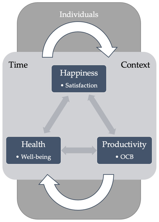 Ryff et al. [40] report that workers with higher levels of well-being tend to be more productive and have better physical and psychological health when compared to workers with low levels of well-being. Expanding on such a view, Wright and Cropanzano [41] in their seminal work on the happy–productive hypothesis, discuss the importance of the combined effects of well-being and job satisfaction as predictors of job performance. Recent literature addresses this relationship, referring to the combined influence of both well-being and job satisfaction as predicting stressors of positive emotions [42], and gaining traction during the COVID-19 pandemic as a combination of measures to understand the needs of organizational support [43]. Therefore, we propose well-being to be a proxy for the Health indicator of sustainable careers by De Vos and colleagues [1]. According to Salas-Vallina and Alegre [28,29], the emotional response that results from meeting the satisfaction requirements of individuals with the nature of their work establishes conceptual parallels with those present in happiness, also promoting feelings of well-being that are strictly linked to the concerns of current organizations [44]. Considering the relationship between well-being and job satisfaction [30] as well as the idea of a convergent relationship between the three indicators of a sustainable career [44,45], we propose that: