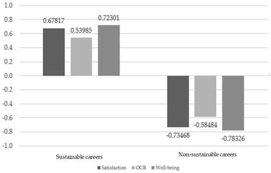 There are interactions that relate the three indicators’ proxies (satisfaction, well-being and OCB), creating patterns of employees with higher and lower levels of sustainable careers.
