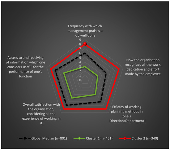 Of all variables mentioned in Table 3, enthusiastic workers (Cluster 2) are more prone to remain in the organisation given that a superior median in all variables was verified when comparing it to its global median. This was ascertained in all variables (median 8.01) except for the following: frequency with which management praises a job well done; the way an organisation recognises all work performed, dedication, and efforts made by workers (median 8). Cluster 1 presents a median inferior when in comparison with the global median. The Cluster related to workers in churning was evidenced in the following variables: frequency with which management praises a job well done; how an organisation recognises all work performed, dedication, and efforts made by workers (median 2.99); efficacy of the working planning methods in one’s direction/department (median 4.01); global satisfaction with the organisation considering all working experience within the latter; access to and receiving of information one considers useful for performing one’s functions (median 4.99).