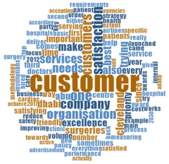 In the first round of interviews, participants were asked questions regarding the organizational structure, culture, and processes, to discover the extent, and how, NPM has been implemented in Abu Dhabi’s public organizations. Our participants unanimously agreed that the application of NPM principles in Abu Dhabi’s public organizations has contributed towards achieving superior levels of efficiency and productivity, while delivering higher quality services to citizens. Although all participants reported that providing high quality services and achieving customer satisfaction are objectives of their organization, the emphasis is stronger in organizations that more strongly apply NPM principles. The focus on serving customers is illustrated by the word cloud (Figure 1), generated using the NVivo software.