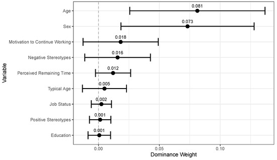 We also followed up this regression analysis with a dominance analysis (see Figure 1), which decomposes the model into unique contributions expressed in terms of dominance weights (DW). From this analysis, only age ( = 0.081) and sex ( = 0.073) contributed uniquely to the variance explained in older worker age.