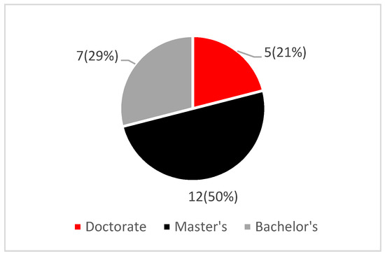 Fourteen (58%) of the women in the study are currently married, and all but three have children. Five (21%) are divorced, four (17%) are single, and one is a widower. The typical participant had 6–10 years of experience and an advanced degree. Seventeen (71%) women hold advanced degrees, including three with PhD degrees, two with the JD, and 12 have master’s degrees. Figure 1 shows participant education levels. Eleven (46%) of the participants are in the Mid-Atlantic region of the United States, four (17%) are in the Southeast, four (17%) are on the West Coast, two (8%) are in the Northwest, and two (8.3%) are in the Northeast.