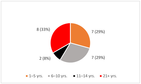 The women are diverse ethnically and culturally and range widely in age. Two-thirds of the women, 15 (63%), are White; five (21%) are Black: and the remaining women included two (8%) Latinx and two (8%) of Asian descent. While not planned, the race/ethnicity of the women closely reflected the current general population of women in senior leadership positions in the United States. Two (8%) women are ages 35–42, four (17%) are ages 43–50, seven (29%) are 51–58, with the balance of 11 (46%) at 59–70+. The age distribution is reasonable for a group where one-third (33%) of the women have 21+ years of senior management experience. Two (8%) have 11–14 years, seven (29%) have 6–10, and the remaining seven (29%) have 1–5 years of experience. Figure 2 presents the participant years of senior management experience.