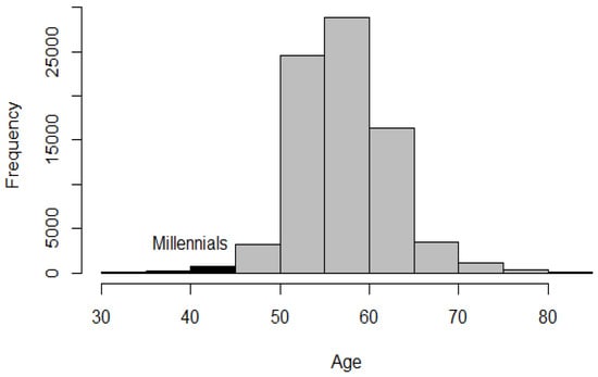 The data used for the analysis are part of a simplified version of the SHARE ( Survey of Health, Ageing, and Retirement in Europe), i.e., easyShare (release 8.0.0., October 2022) [51], which consists of the same number of observations, but includes fewer variables than its complete and more complex counterpart (a request to access SHARE data was made on 2 November 2022 via email, and was approved on 3 November 2022). The simplified version is sufficient for the present analysis as it includes all variables of interest. The creation of the sample of interest was based on two conditions: (a) age range and (b) notified response to the question informing the target variable. Concerning the age condition, in line with the research objective, only Millennial respondents born between 1980 and 1999 are included in the analysis. As shown in Figure 1, Millennials take up a relatively small proportion of the easySHARE dataset. This is expected as SHARE surveys are targeted at people aged 50 and older. However, the Millennial sample is still of sufficient size for an exploratory analysis. Survey respondents come from 25 countries (see Appendix A, countries include 23 EU member states (excluding Romania, Malta, Lithuania, and Cyprus), as well as Switzerland and Israel).